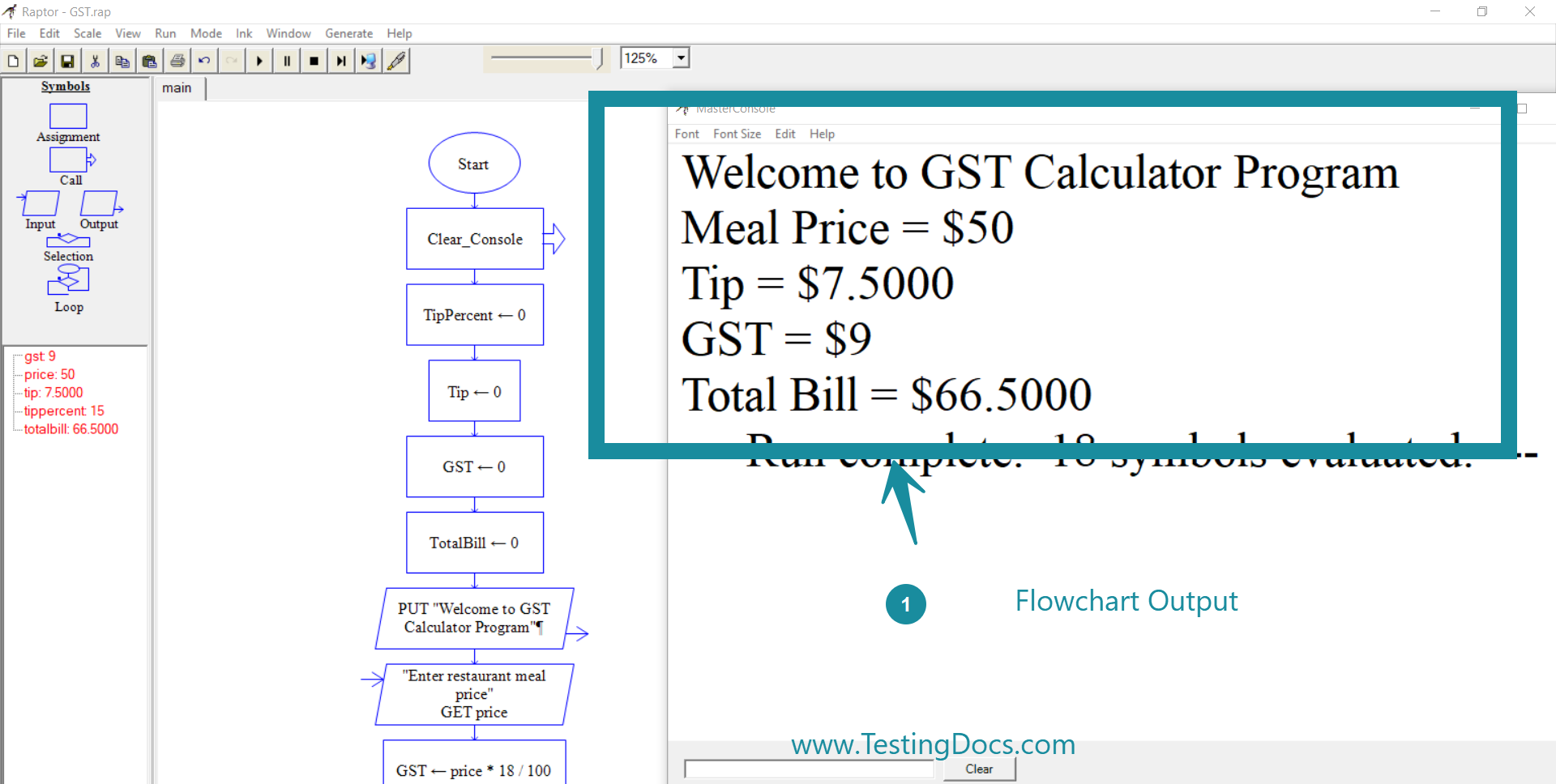Raptor flowchart that will calculate the Tip% and 18% GST on a restaurant meal price. The user will enter the price and the flowchart will calculate